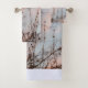 Budded elder branches silhouetted by a pastel sky on a rustic textured wood background.