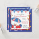 Red, white and blue patriotic barbecue party invitation with stars and stripes, rockets, fireworks, banner of flags and a outdoor patio set with umbrella and the table set for you picnic items. Perfect for the 4th of July, a party after an election or any patriotic party! Hand drawn illustration by McBooboo