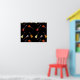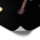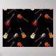 Bold black background with electric and acoustic guitars in rich colours in a patterned collage arrangement.