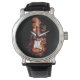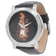 Let the world know that rock 'n' roll will never die with this rock and roll wrist watch, depicting an electric guitar cloaked in mystic flames. Flaming guitar on a black background with a black leather watchband. This would make an great gift for the music lover in your life.