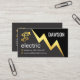 A faux gold lightning strike demarcates an upper black layer against its lower grey piece. At the top of the card you have your prestigious name. To its left is a gold letter-e home cable logo you can use. This is followed by the business name "electric" which you can change. Contact details or captions are placed in their respective gold "electrical symbol" buttons near the base.