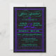 This bold and bright electric teal, purple and subtle black damask wedding invitation, including special sections for directions and RSVP on the back, has a vintage, old fashioned feel with old-timey letter design, including elaborate script elements, a decorative banner, stars and a swirly ampersand. The fancy invitation is inspired by both vintage design and stylish posters. The text reads: "You're Invited to the wedding of [customisable name] & [customisable name] [customisable date] [customisable time]. Please Join Us for an Unforgettable Celebration". Further personalise the invitation with the wedding ceremony and reception information and address, each in their own box with dotted border.