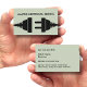 Newly created Electrician business card template in a bold and simple two side design with graphic image of an electrical cord and plug with your business name featured on the front and your contact information laid out on the flip side. Created for an electric contractor or independent electrician service.
