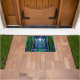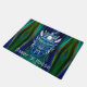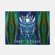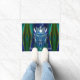 Futuristic looking door mat, with graphic artwork of A metallic pink and red robot head with electrical currents going up and down from it. Custom text, on the bottom, is ready to personalise to read what you want.