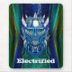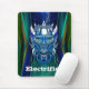 Futuristic looking mousepad, with graphic artwork of A metallic blue robot head with electrical currents going up and down from it. Custom text, on the bottom, is ready to personalise to read what you want.