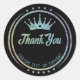 Thank You sticker decorated with a crown, round frame and stars. Finished with premium electroplated gradient colour effect with room for personalisation with custom text message or business logo.