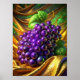 "On the luxurious golden tablecloth, a cluster of plump, succulent grapes glistens in the soft light. Their rich hues of deep purple and vibrant green create a stunning contrast against the shimmering fabric. The smooth skin of the grapes reflects a delicate sheen, inviting one to reach out and savour their sweet, juicy flavour. The elegance of the scene is enhanced by the subtle play of light and shadow, making the grapes appear almost like jewels on the lavish backdrop."