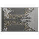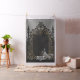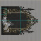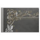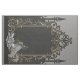 Elegance in silver and black. This image features a black and white illustration of a wedding frame with intricate gold and silver embellishments. The frame is adorned with ornate floral patterns and a central archway. A bride in a flowing gown, holding a bouquet, stands within the frame, facing away from the viewer. The background is a textured black surface, creating a dramatic and elegant atmosphere.