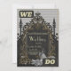 Elegance in silver and black. This image features a black and white illustration of a wedding frame with intricate gold and silver embellishments. The frame is adorned with ornate floral patterns and a central archway. A bride in a flowing gown, holding a bouquet, stands within the frame, facing away from the viewer. The background is a textured black surface, creating a dramatic and elegant atmosphere.