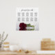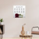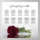 This beautiful wedding seating chart has table assignments for 100 guests at 10 tables (10 people per table.) The design is stylish, classy, romantic and chic, featuring a single burgundy, maroon, or wine-red coloured rose reflecting in water with waves and ripples. There is a lacy script calligraphy title reading "please find your table" as well as space for the names of the couple and the wedding date. Great way to make your reception beautiful while helping your guests find the right seat.