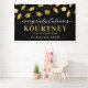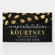 Modern graduation party banner featuring a trendy black background that can be changed to any color, falling faux gold foil mortarboard caps, and a congratulations text template that is easy to personalize.