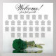 Introduce your wedding reception in style with this stunning 29 table seating chart adorned with a classic design featuring a single long-stemmed deep emerald green coloured rose lying on its side, beautifully reflecting in water. The elegant script lettering welcomes guests with the message "Welcome! Please find your table" and has space for 290 names or guests with ten seats per table, accompanied by the couple's names and wedding date at the bottom. This seating chart exudes sophistication, style, and romantic elegance, making it a wonderful way to add a touch of glamour to your special day while helping your guests find their seats with ease.
