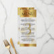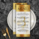 Add sophistication to 3rd leather wedding anniversary celebrations with this dinner menu, which features elegant lettering with gold-dusted hexagonal confetti on a luxurious white leather background bordered by gold foil. Customise with couple's names, dates of marriage, venue details, menu items, and congratulatory messages.