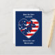 Elegant independance day patriotic girly girl heart. This has a red and white stripes, and a blue damask motif on the left side with some white stars here and there. Shown here on a save the date wedding postcard.
