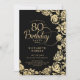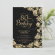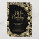 Black gold floral 80th birthday party invitation. Elegant design featuring roses, faux gold foil and typography script font. Trendy invite card perfect for a stylish female bday celebration. Can be customised to any age. Personalise with your own details. Printed Zazzle invitations or instant download digital printable template.