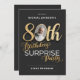 Elegant 80th Birthday Surprise Party Program. A sleek design with clear, easy-to-read text, ensuring that all the important details are conveyed effortlessly. The addition of faux foil accents in dazzling gold against a backdrop of black creates a striking visual effect, adding a touch of luxury to the overall look. With its modern aesthetics and timeless charm, this invitation sets the stage for a memorable celebration, leaving your loved ones excited and eagerly anticipating the surprises that await. Choose this design to make a stylish statement and create an unforgettable experience for your guests.
