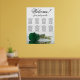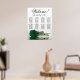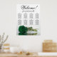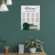 This stunning wedding seating chart includes 8 tables and showcases a modern and romantic floral design. A long-stemmed emerald green rose is displayed on its side, reflecting in a pool of water, adding to the elegance of the chart. The title, "Welcome! please find your table," is written in elegant script calligraphy, while the names of the couple and the date of the wedding are located at the bottom. With seating arrangements for 80 people and 10 seats per table, this seating chart is a fantastic way to greet guests and help them locate their seats at the reception.