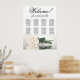 This stunning wedding seating chart includes 8 tables and showcases a modern and romantic floral design. A long-stemmed ivory, white, or cream-coloured rose is displayed on its side, reflecting in a pool of water, adding to the elegance of the chart. The title, "Welcome! please find your table," is written in elegant script calligraphy, while the names of the couple and the date of the wedding are located at the bottom. With seating arrangements for 80 people and 10 seats per table, this seating chart is a fantastic way to greet guests and help them locate their seats at the reception.