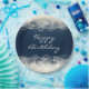 A fancy elegant abstract design with cream coloured lace and pearls made with circles and bubbles. The background is dark blue with faded squares off to the side. Pretty and delicate design. Happy birthday written in a fancy script font.