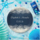 A fancy elegant abstract design with cream coloured lace and pearls made with circles and bubbles. The background is dark blue with faded squares off to the side. Pretty and delicate design. Congratulations written in a fancy script font. Customise / personalise with the bride and grooms name and their wedding date.