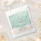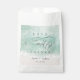 Romantic coastal themed wedding favour bags feature beautiful turquoise abstract watercolor sparkling ocean wave and beach background, toped with stylish script and elegant font event details, modern and simple, great for sand beach wedding, tropical destination wedding, coastal ocean themed wedding.