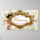 Adorable African Princess wearing a gold crown with white diaper and pink bunny slippers on top a fancy golden filigree frame on a white & gold marble background. ©2022 Miss Sassy Party Designs
