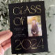 Classic and modern foil graduation announcement for high school, college, university, med school, law school or other with photo and elegant design for the class of 2024.