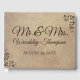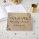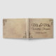 This custom wedding guest book features an elegant and rustic design with a parchment paper style background. The design resembles a faded antique parchment scroll. The titles "Mr." and "Mrs." are printed in a large elegant, chocolate brown font followed by the surname. The date of the wedding is printed below. A matching design appears on the back and the couple's names and wedding date are printed on the spine. You can personalise the guest book with your own names and custom date. Floral designs accent the corners of the book in a matching chocolate brown.