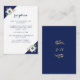 White anemone flowers with golden twigs and leaves forming a beautiful frame. (Gold is not real gold but printed.) Navy blue background. Bride's and Groom's monograms with golden leaves. Sleek and modern wedding design.