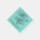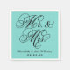 Wedding napkins feature "Mr. & Mrs." in a black calligraphy script font with custom monogram design that can be personalised with the bride and groom's married name and wedding date. Aqua blue and black colour scheme.