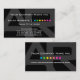 Elegant business cards in elegant black and grey with a row of vibrantly coloured polka dots. Customisable monogram in the background.