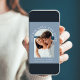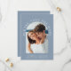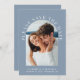 Modern dusty blue wedding save the date card featuring your photo in an arched frame surrounded by "Please Save The Date" in elegant white typography. Under your photo, add your first names, wedding date and location. On the reverse side, personalise the save the date details in simple white typography.