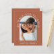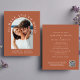Budget-friendly all-in-one terracotta wedding invitation featuring your photo in an arch frame surrounded by "To Have And To Hold" in elegant white typography. Under your photo, add your first names, wedding date and location in modern white typography. On the reverse side, customise your invitation and input your wedding website address to create a scannable QR code for your guests to scan to RSVP online and obtain additional wedding details such as accommodations.