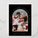 Stylish black elopement or private wedding announcement and reception invitation featuring your photo in an arched frame and "Happily Ever After Party" in elegant typography in real gold foil. Add your first names, wedding date and location. On the reverse side, personalise your marriage announcement and party or reception invitation and add your names in a signature-like script.