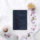 This wedding invitation showcases a rich navy blue background with flowing rose gold floral illustrations, creating a timeless and luxurious look. The elegant script font paired with classic serif text strikes a balance between modern romance and refined sophistication. Delicate metallic accents and a softly illustrated bee add a whimsical yet upscale touch, perfect for evening weddings or formal events with a romantic, botanical flair.
