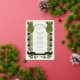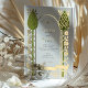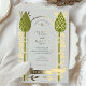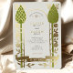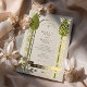 Make a grand statement with this exquisite wedding invitation, deeply inspired by the elegance of the Art Nouveau and Arts & Crafts movements. This highly stylised design features a symmetrical archway created from olive green thistle-like botanicals, all beautifully outlined in a luxurious faux gold foil. Delicate gold roses climb the stately stems, adding a touch of romance. Your wedding details are gracefully framed within this architectural arch, set against a sophisticated, soft grey background. A prominent gold banner at the bottom elegantly displays your wedding date, adding a final regal touch. This invitation, with its refined colour palette and unique artistic flair, is perfect for a formal, vintage, or uniquely stylish wedding celebration.
