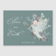 Elegant artistic dove in in flight with gold border holding olive branch embellished with watercolor flowers and line-drawn leaves with custom "Peace on Earth" script on olive green background.