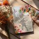 This elegant wedding invitation features a loose painted abstract floral motif in warm fall tones—burnt sienna, plum, rose, and olive—paired with a simple serif and script font layout wit a photo overlay. The personalised monogram in the top corner adds a subtle, refined touch. Ideal for romantic fall weddings or modern couples who want a blend of minimalism and artistry. Perfect for outdoor, vineyard, countryside, or garden ceremonies with an autumn palette.