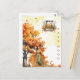 Elegant Autumn Watercolor Falling Leaves Fall , Postcard featuring an illustration of trees going through seasonal changes in the background with falling leaves in vibrant, rustic orange, yellow and red hues. A woman in fall apparel walking in the foreground swept up in the autumn wind and a swirl of falling leaves. The script Fall Mood to the left of the images in a colour to match the illustration.