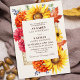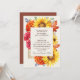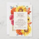 Set the stage for an elegant event with this autumn wedding invitation. A lush and luxurious floral wedding invitation featuring a frame of sunflowers, red mums, lantanas, black-eyed susans, autumn leaves and blue berries against a cream background. It is perfect for a dramatic and unforgettable celebration. They are ideal for those who appreciate timeless allure. PLEASE NOTE: The gold featured in this design is NOT REAL foil.