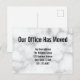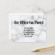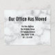 The top line of display text says 'Our office has moved'. You can personalise your moving announcement with your company's name, new address, and phone number. The moving announcement has a faux white marble design.