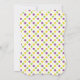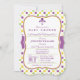Elegant neutral baby shower invite on purple, yellow, green, and white polks dots pattern. Vintage, formal invitation design for boy or girl baby shower.