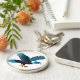 Bald eagle emblem with detailed white feathers in flight on a blue circular frame.