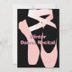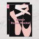 Stylish ballet dance recital invitation, done in black, with graphics of a pink silhouette of pointe shoes, on the front of the invitation. The back is done in black also, with graphics of a pretty pink ribbon and bow, at the top, and custom pink text. Personalise all the text, front and back, to suit your dance studio's needs.
