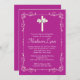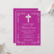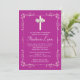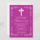 Our beautiful cross baptism invitation or christening invitation features a Stylish floral vine delicate frame surrounding a white cross with a printed on pearl bow set on a magenta pink / purple background. Visit our shop for this invitation in a large selection of modern & trendy colours and to view our selection of religious invitations.