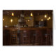 The interior of an elegant bar with a teak bar, bar stools, pendant lamps and a tower of liquor.