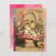 Elegant basket with pink ribbon ,vintage style floral design with white flowers and funny chickens digital painting and watercolor in pink fuchsia green,orange yellow ,teal,aqua blue colours with gold sparkles and silver foil by Bulgan Lumini (c)