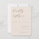 This wedding RSVP card features a minimalist design with a soft beige background, creating an elegant and uncluttered look. The layout includes ample negative space, enhancing readability and sophistication. A flowing script font highlights the phrase "kindly reply by August 1," while sans-serif fonts provide clear options for responses such as "happily accepts" or "sadly declines." Customizable placeholders allow for personalization, making it perfect for formal events that require a touch of class and simplicity.