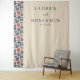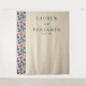 This elegant wedding backdrop features a minimalist design with a vertical layout, divided into two sections. The left side showcases a narrow column adorned with a repeating floral pattern in coral and navy blue hues against a soft beige background, while the right side is text-based, displaying names and date in bold serif fonts with a touch of cursive for an intimate feel. The overall style is contemporary yet timeless, exuding sophistication and refinement through its restrained colour palette and harmonious composition. Perfect for creating a serene and stylish atmosphere at your special event.