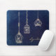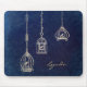 Elegant mouse pad done in a distressed blue floral pattern, with graphics of three antique looking hanging bird cages. Text, at the bottom, done in a pale tan, is ready to personalise. Lovely way to dress up your desk at home or at the office.